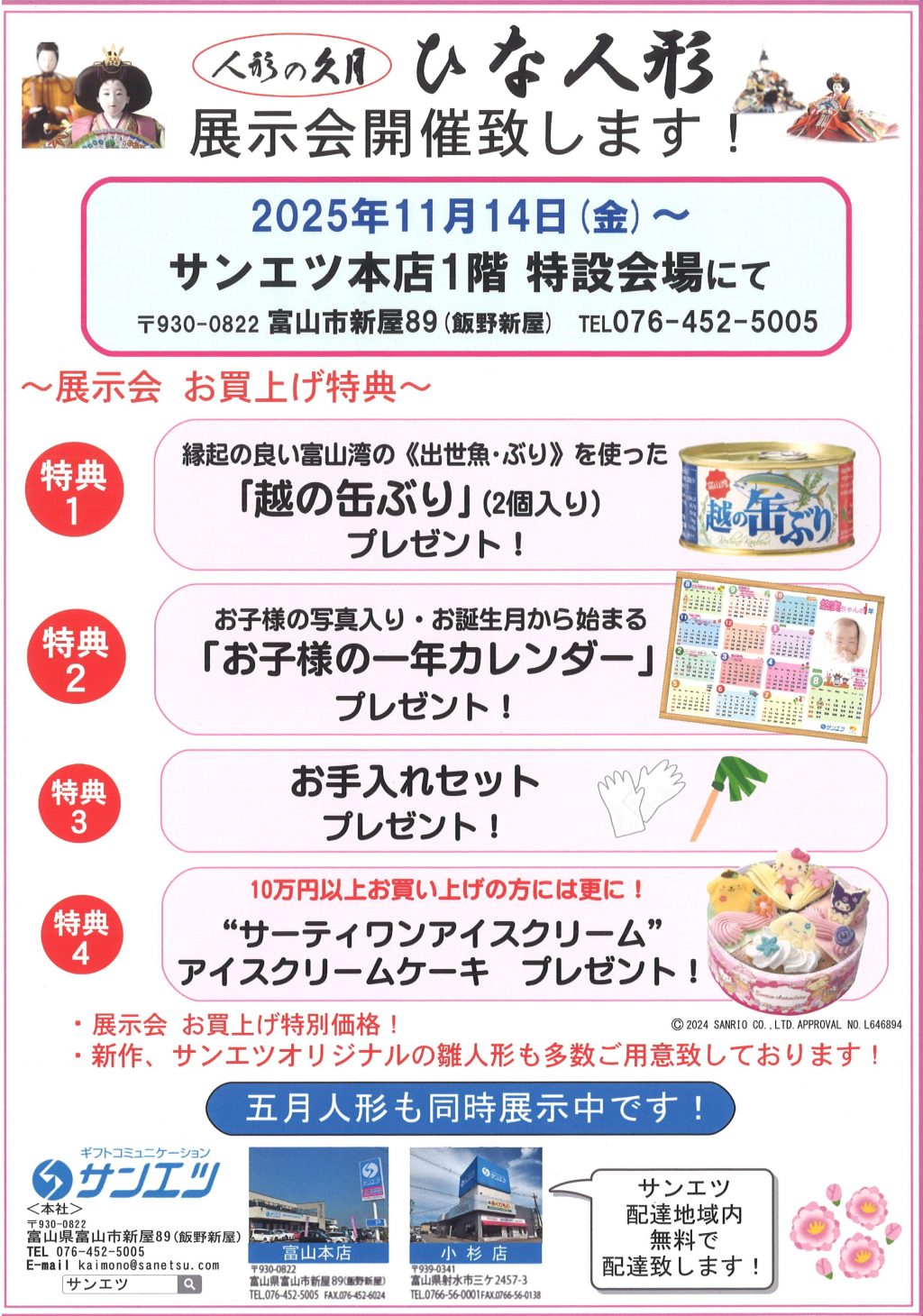 サンエツにて ひな人形をお買い上げのお客様には、サンエツならではの素敵なプレゼントもご用意しております!