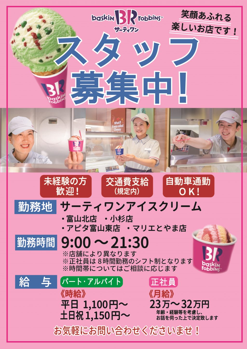 今回リニューアルオープンをする富山北店をはじめ、サンエツが運営しているサーティワンアイスクリーム(富山北店・小杉店・アピタ富山東店・マリエとやま店)では、一緒に働いていただける方を募集しております。