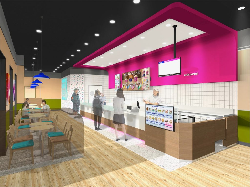新しい店舗はサーティワンのポップな印象はそのままに、ゆっくりアイスクリームをお召し上がりいただける落ち着いたイートインスペースを広く備えた店内になっております。