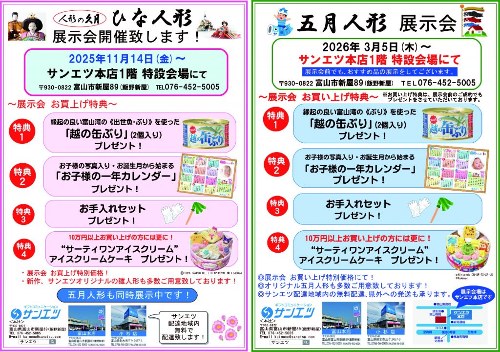 サンエツにてひな人形・五月人形をお買い上げの方には、サンエツならではの素敵なプレゼントもご用意しております!