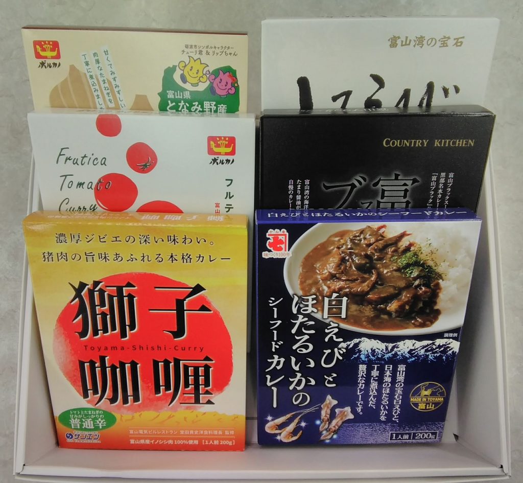 好評をいただいておりますサンエツオリジナルの イノシシ肉を使ったジビエカレー「獅子咖喱」と、富山の水と大地で育んだ野菜のカレー、富山湾の白えびやホタルイカのカレーなどを詰め合わせた、「富山のカレー詰合せ」も喜ばれています。