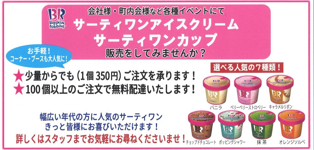 また、カップ入りのサーティワンアイスクリームは、各種イベント会場での販売にも大人気です!
